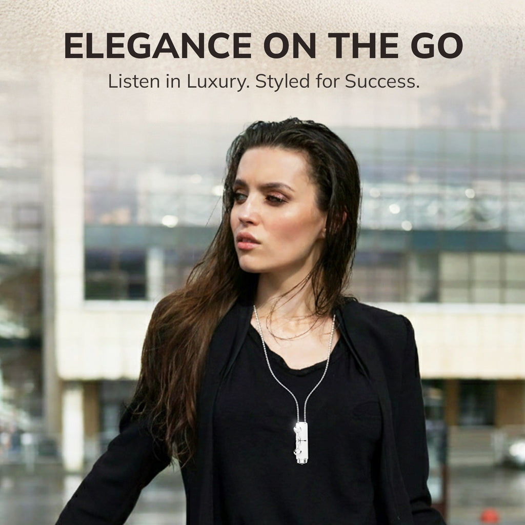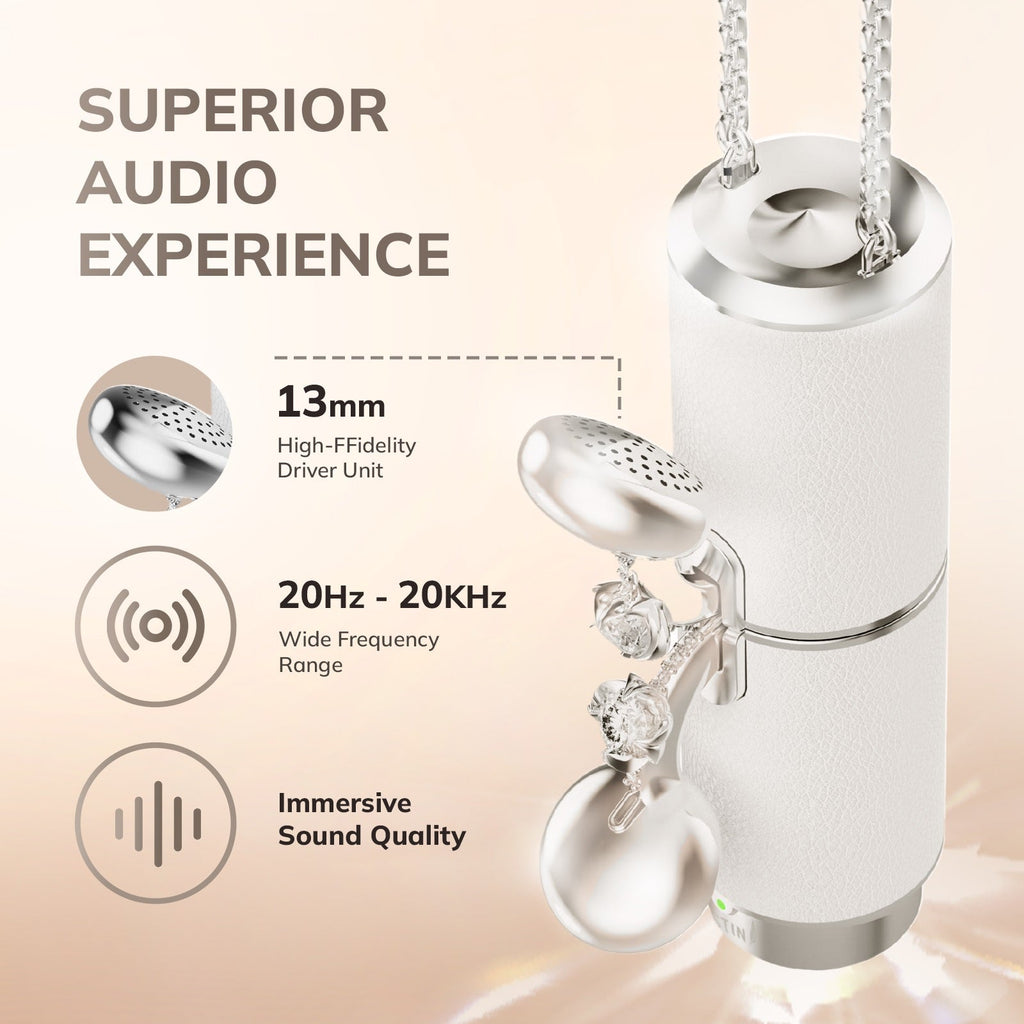 Experience premium audio freedom. Fine-tuned acoustic drivers deliver balanced Hi-Fi sound with rich detail. Enjoy up to 8 hours of continuous playback on a single charge—enough for a full workday or long trip. The charging necklace provides additional power for all-day use.